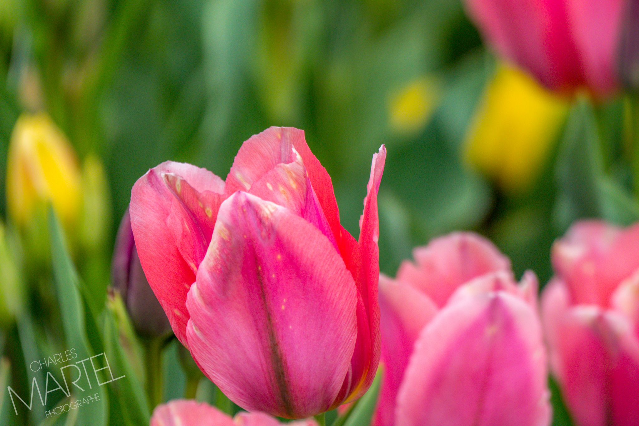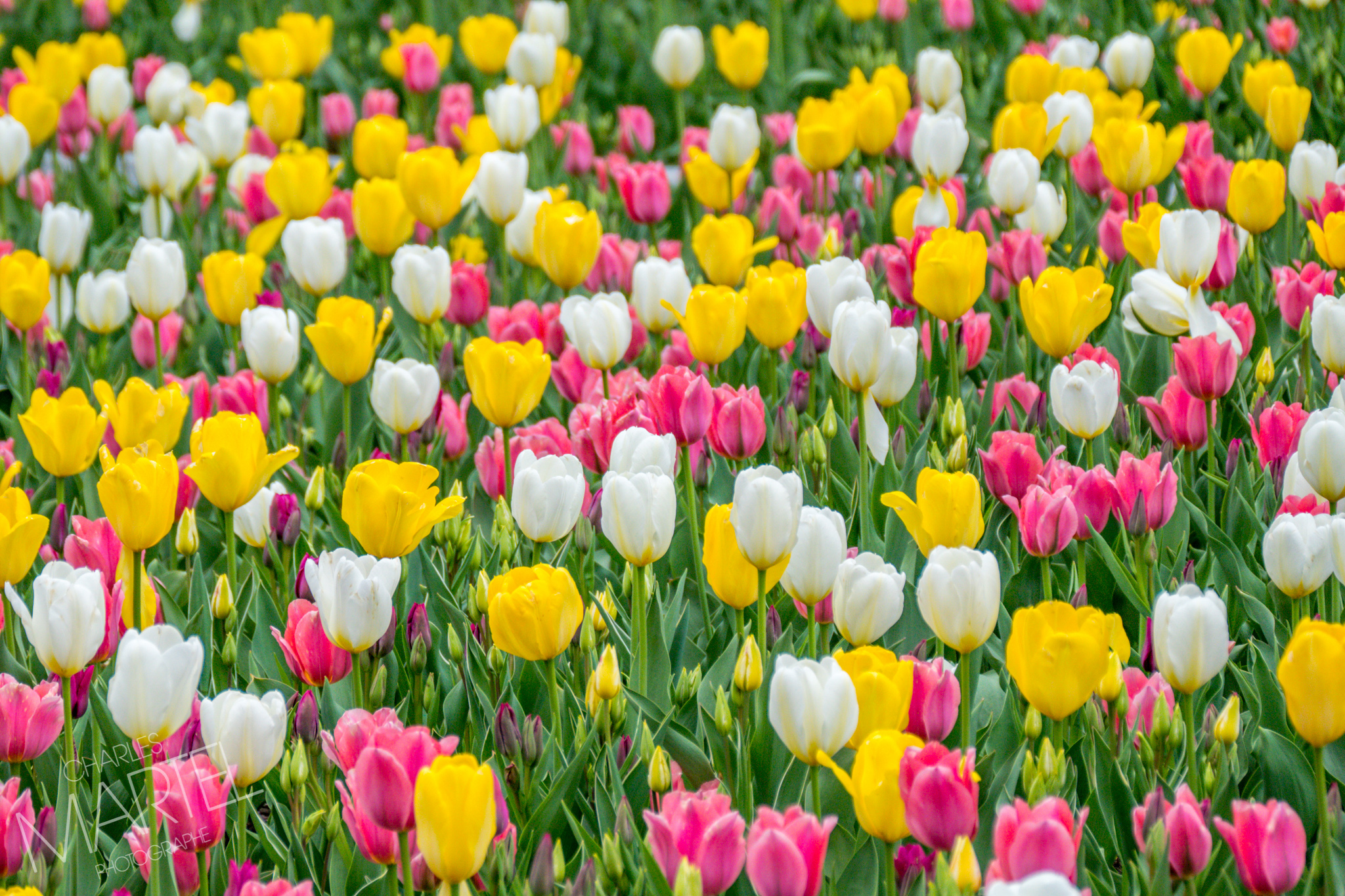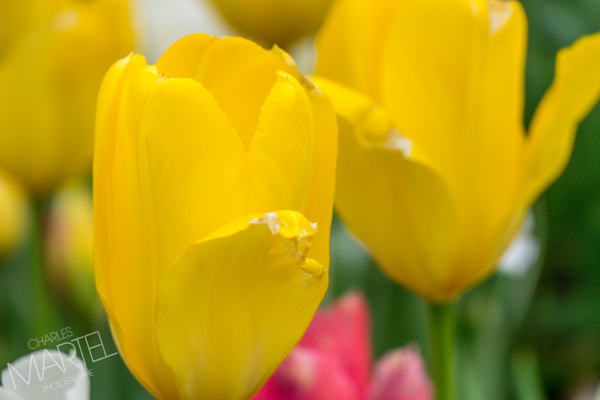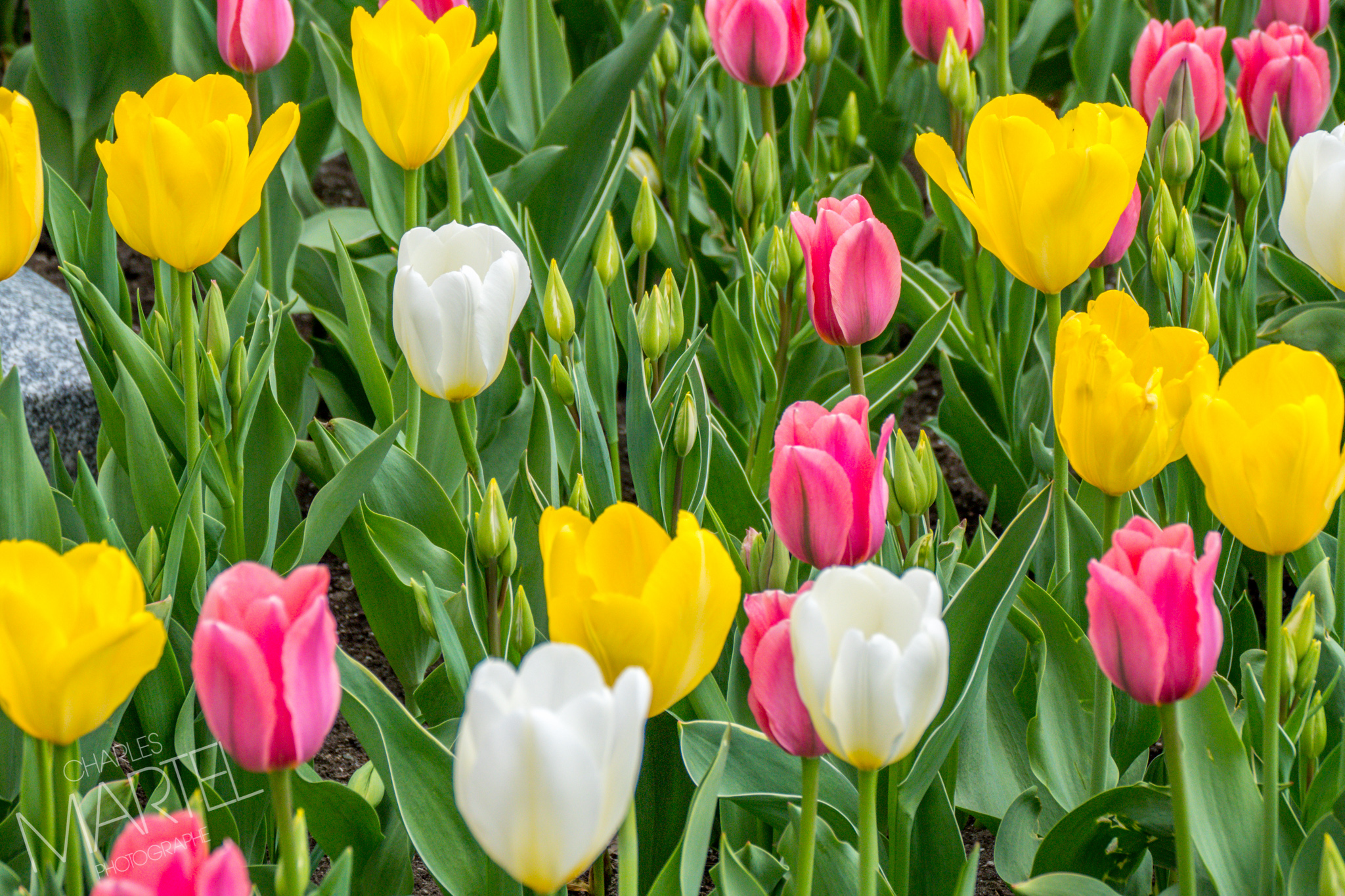 - banc de tulipes jaunes blanches roses près des fontaines de l’entrèe, printemps, jardin botanique, Montréal, Qc