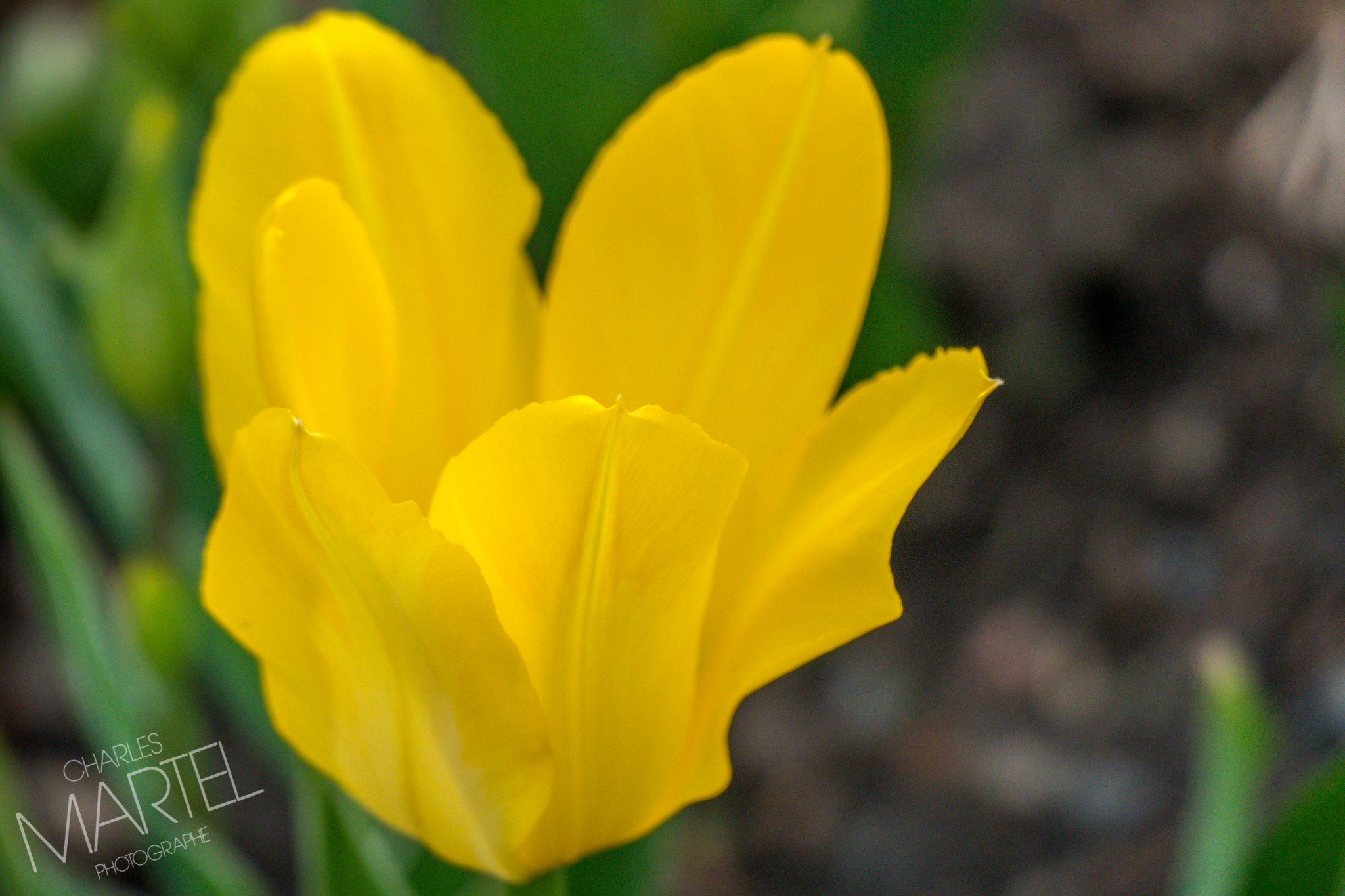 - banc de tulipes jaunes blanches roses près de la billetterie, printemps, jardin botanique, Montréal, Qc