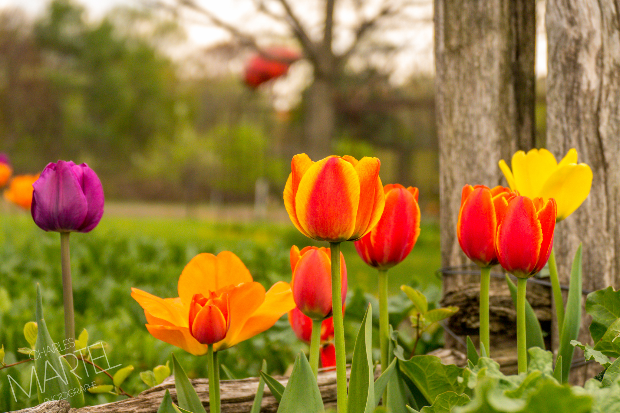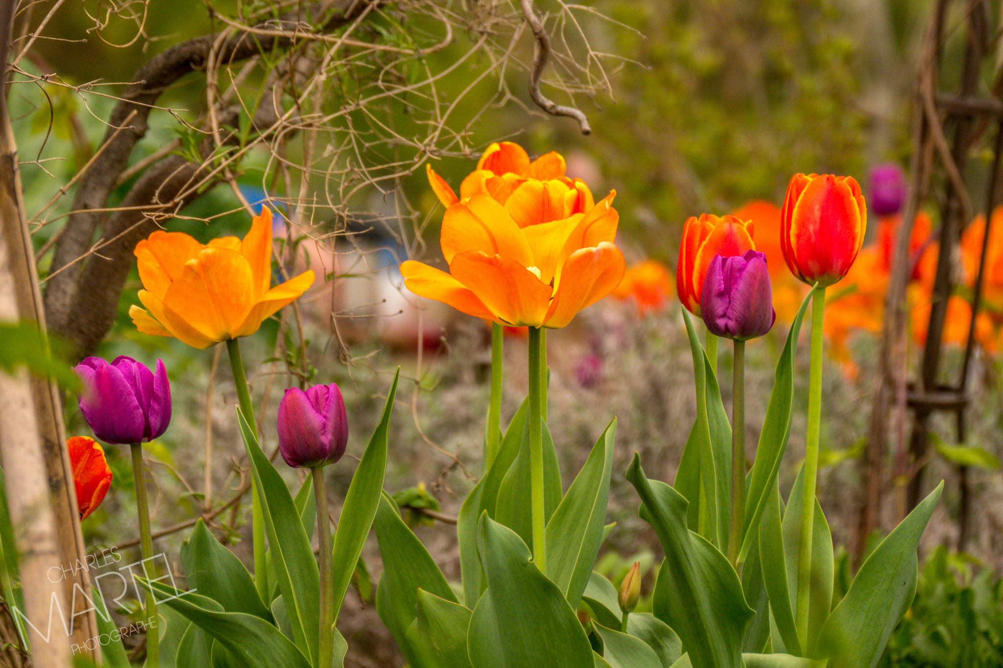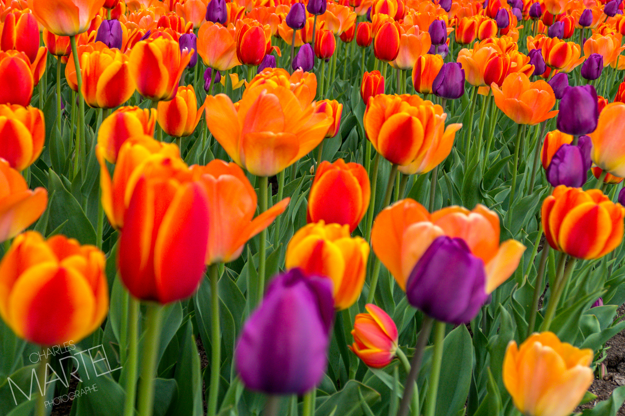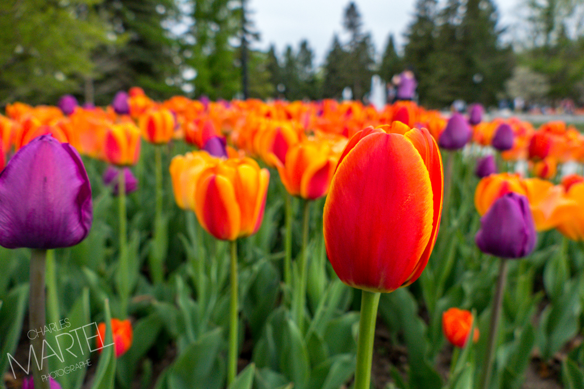 - banc de tulipes rouges-orangées, oranges et mauve près des fontaines de l’entrèe, printemps, jardin botanique, Montréal, Qc